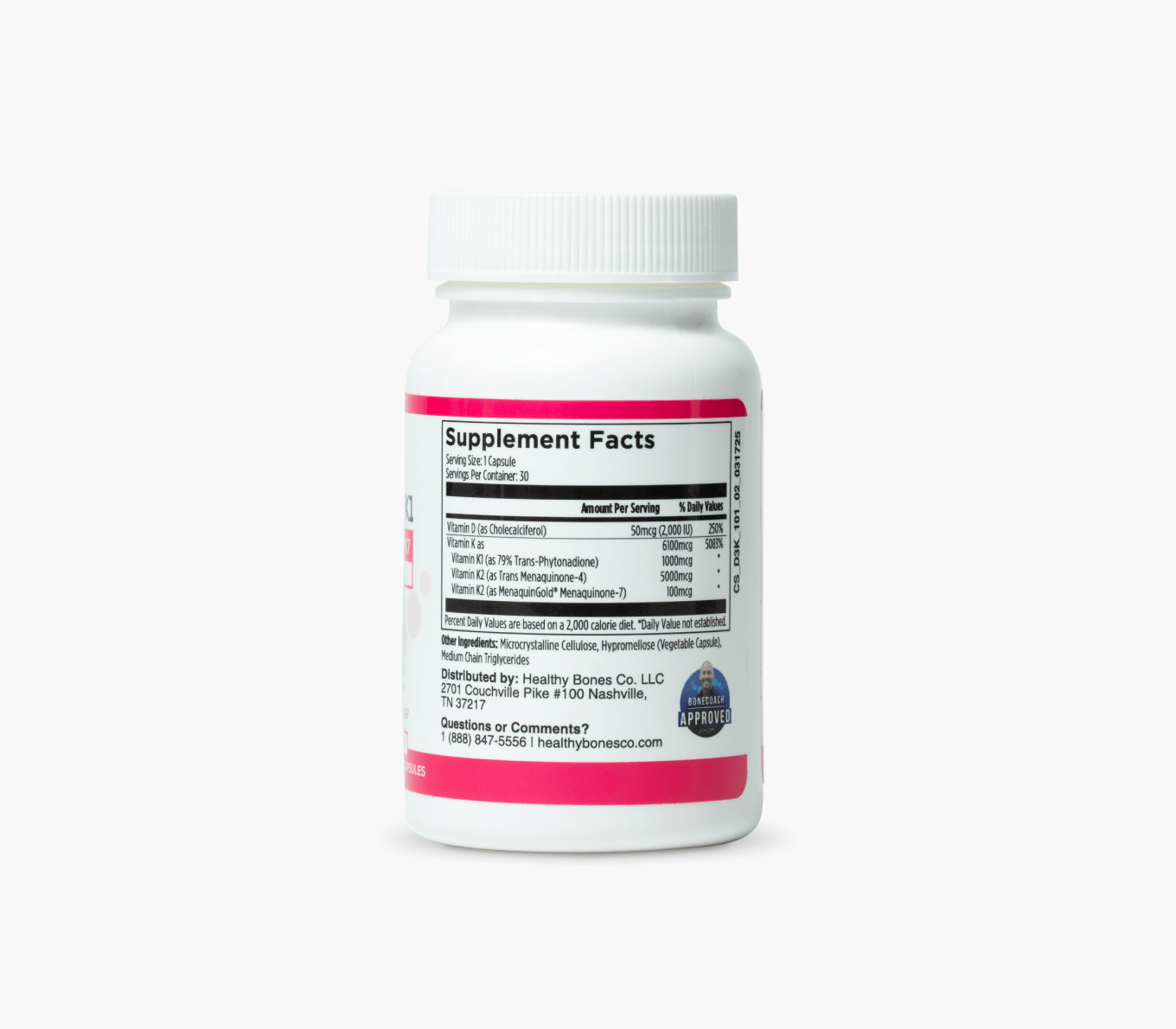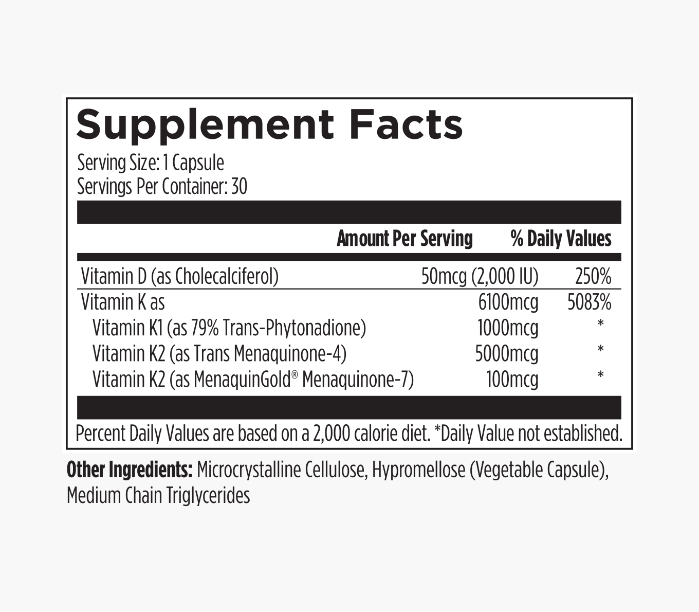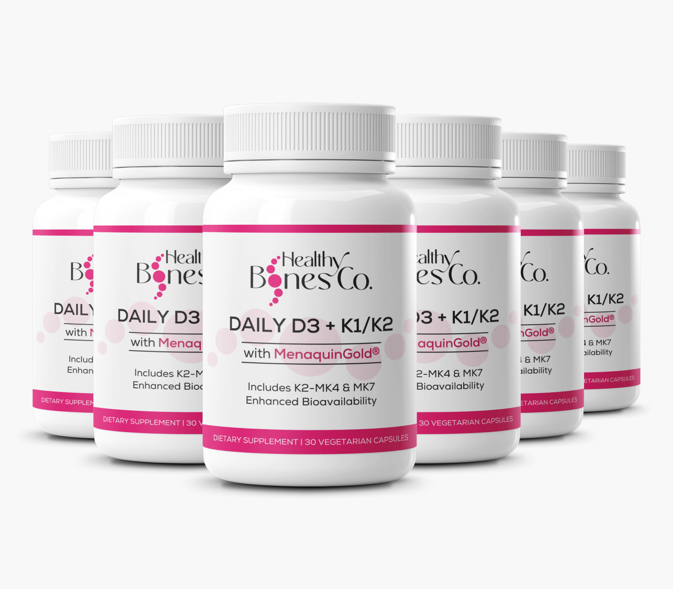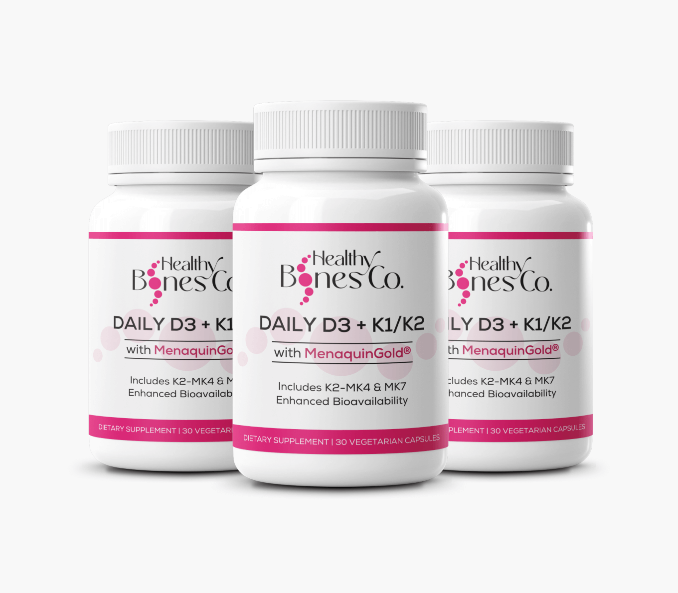 Healthy Bones Co. Daily D3+K1/K2 is a concentrated, highly bioavailable vitamin D formulation offering 2000 IU of vitamin D, along with 1000 mcg of vitamin K1 and 5mg of vitamin K2 as Trans Menaquione-4 and 100mcg of K2 as MenaquinGold® Menaquinone-7.