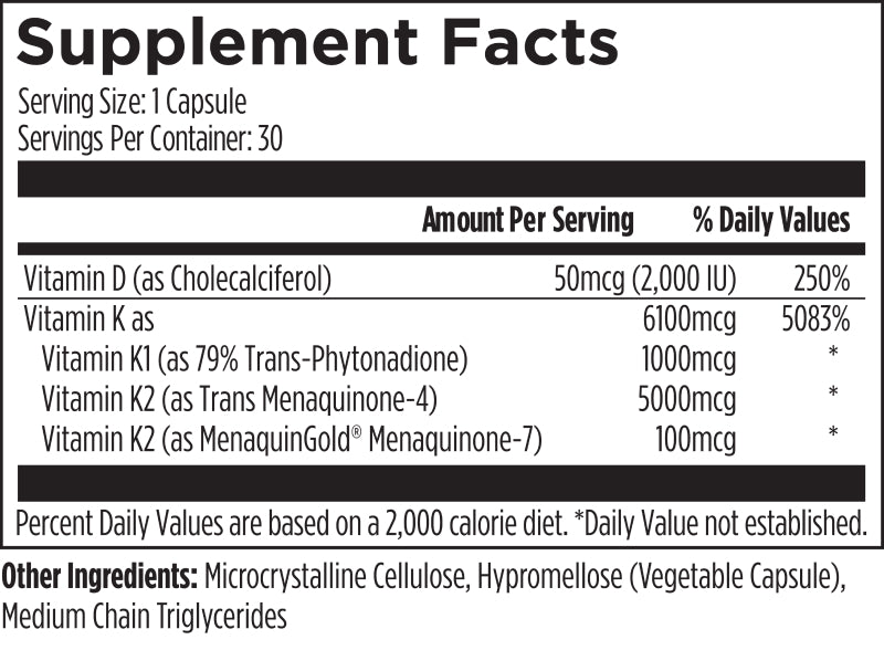 This is a convenient, easy-to-take capsule. Both vitamins D and K are essential for bone and arterial health, and for maintaining immune function. Vitamins K1 and K2 support the deposition of calcium into the bone instead of soft tissue, such as the arterial walls and kidneys.*