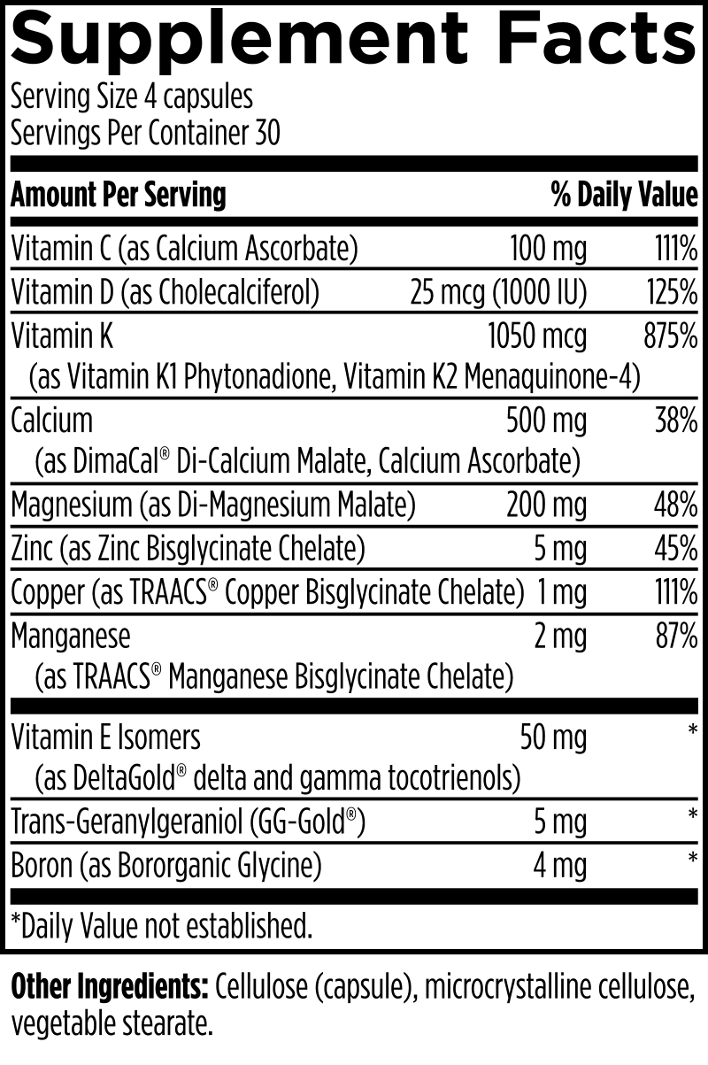 The nutrients in OsteoElements Pro work synergistically to support bone health and integrity.* Calcium is the primary mineral in the hard tissues that provide strength and support. Vitamin D regulates calcium homeostasis, bone mineralization, and bone formation. Vitamin K, supported by geranylgeraniol (GG), plays an important role in supporting the proper trafficking of calcium into the bone. Magnesium also influences proper bone mineralization. Vitamin C supports the synthesis of collagen, which is a critical component of bones and connective tissues. Zinc, copper, manganese, and boron support different aspects of collagen and bone production. Vitamin E tocotrienols help promote a healthy inflammatory response to support bone health.*
